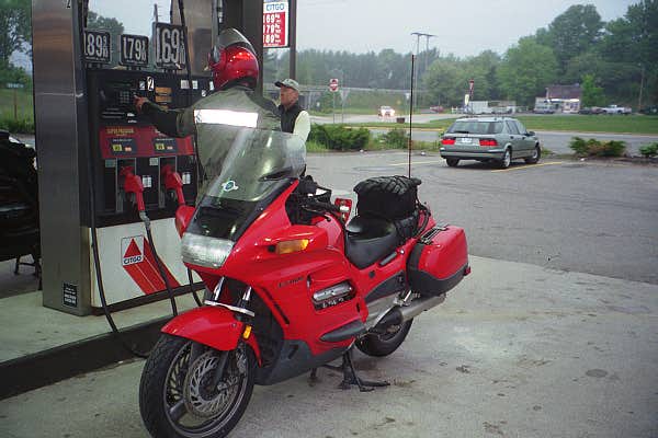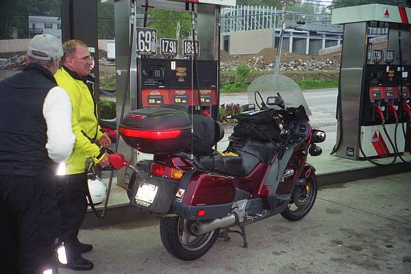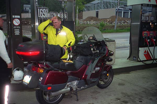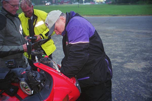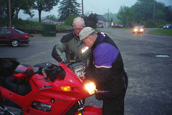 Lee Myrah and Jim Frens. Jim is helping fix Lee's busted headlight. That's Mike Hutsal with the Hi-Viz suit.