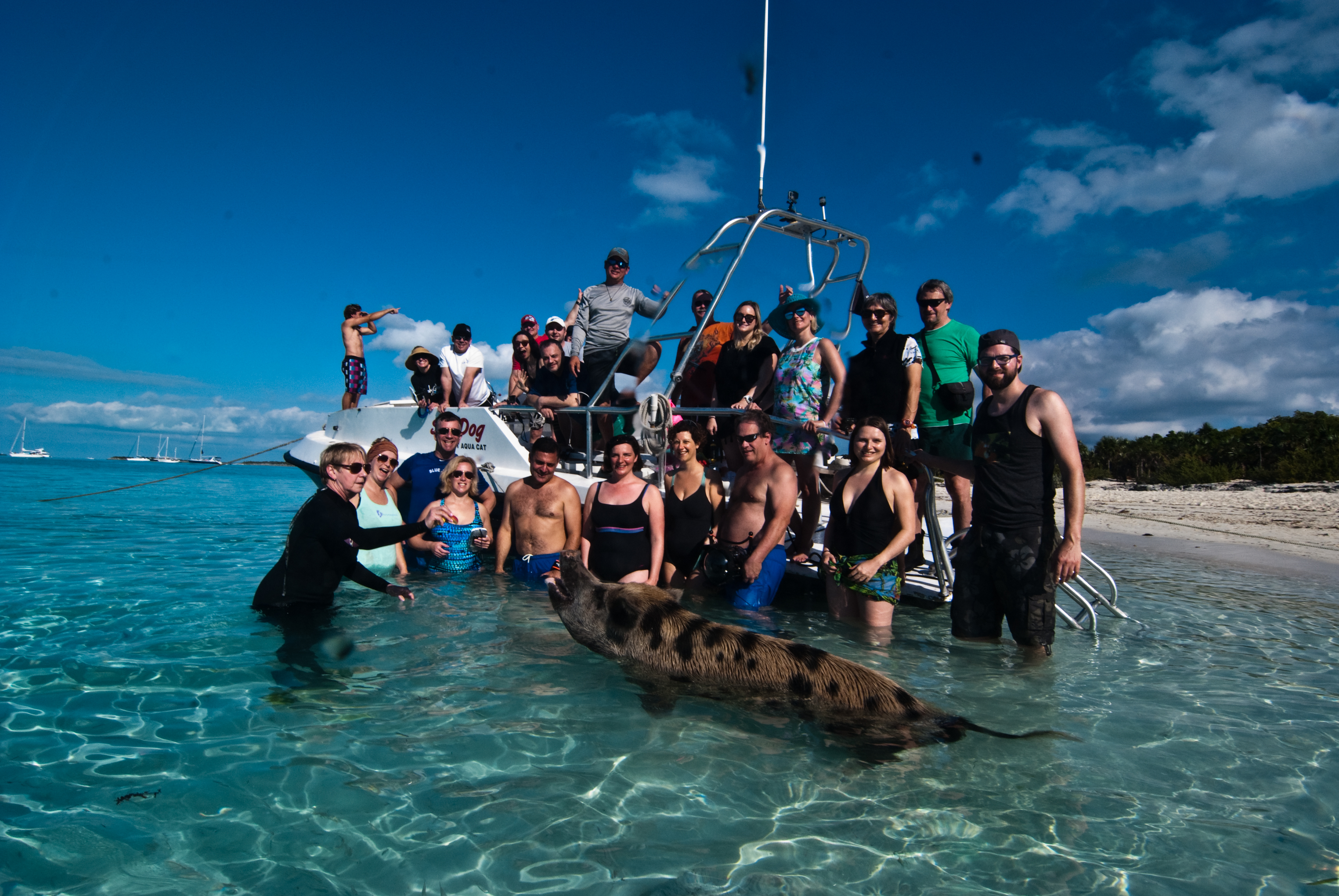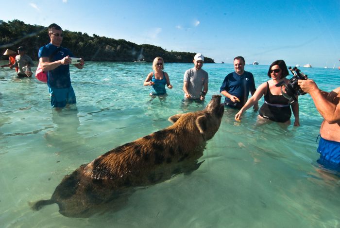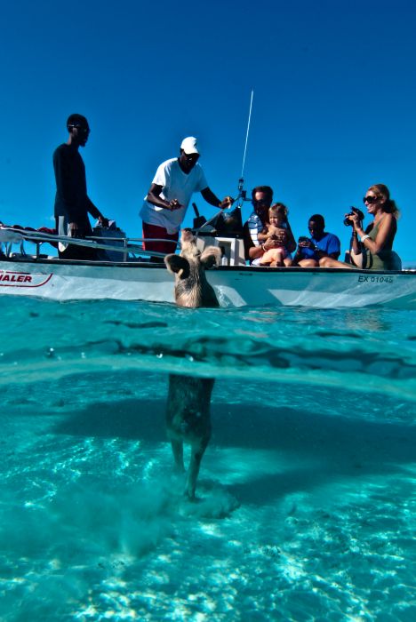 In sailing days, when sailers would find an island with fresh water, they would leave a few pigs and chickens or sometimes goats on the island. This way, when they came back there would be food and water. These particular pigs learned that if they swam out to boats then people would throw food in their mouths. It is pretty darned funny, and a good thing to do first thing in the morning after our New Years celebration.